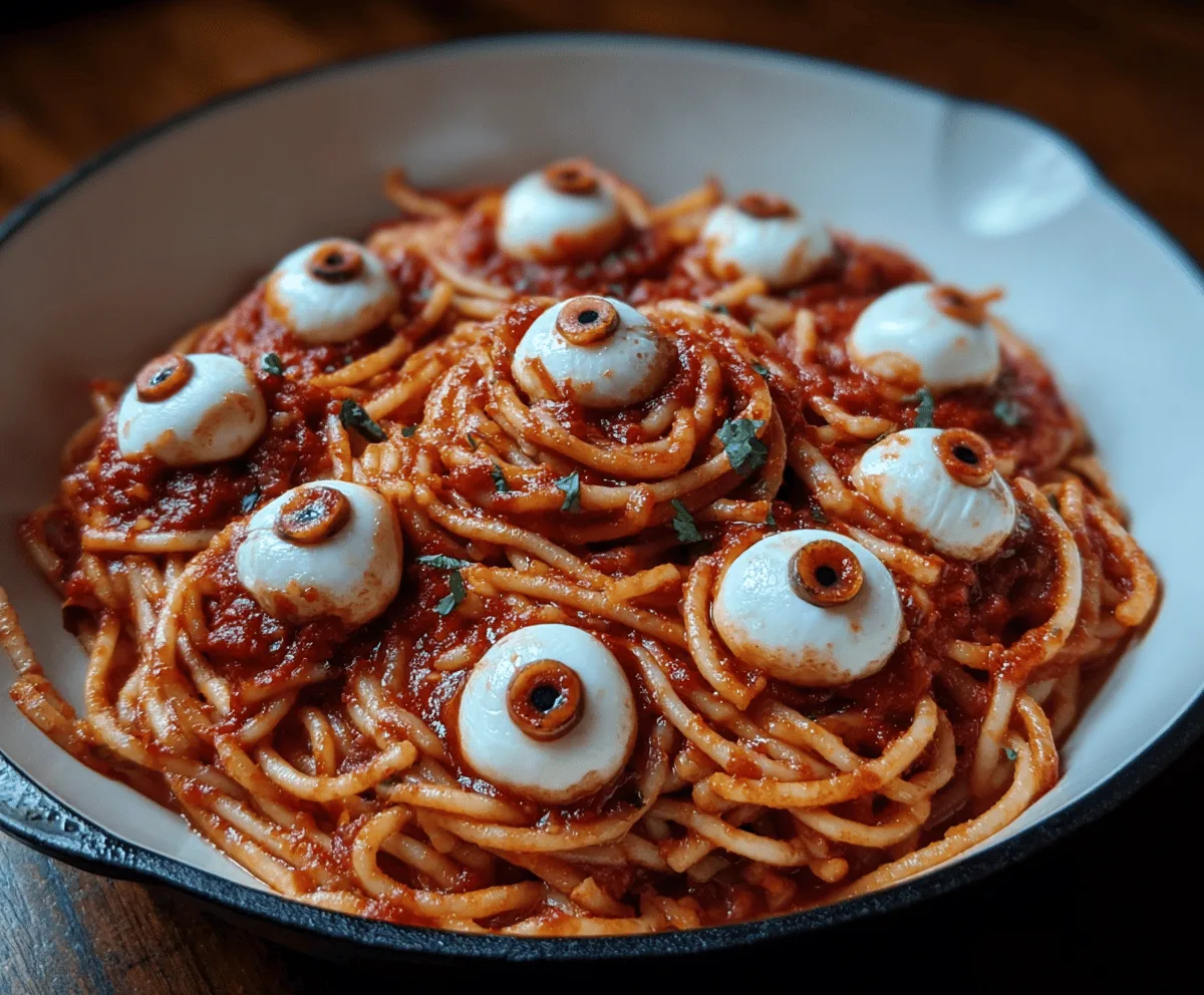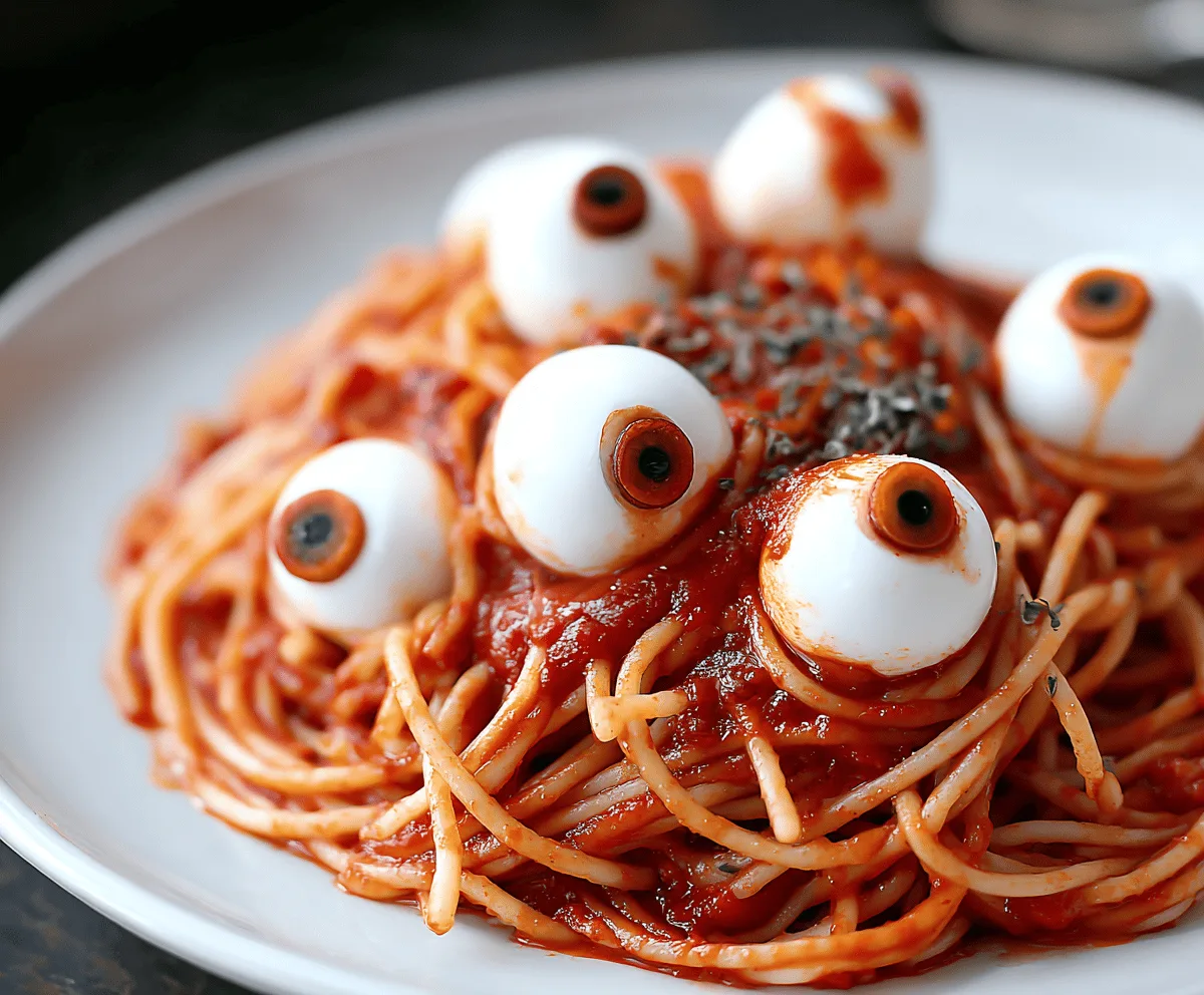 I love making this for Halloween parties because it’s easy to prepare and gets everyone talking (and laughing) around the table. My secret is to add a little garlic and basil to the tomato sauce to keep it tasty beneath all the fun. As for the mozzarella eyeballs, I like to dot them with a small piece of olive or pepper to make the pupil—simple but effective! It’s always a delight to watch people’s reactions when they see those “eyeballs” staring back at them from the plate.