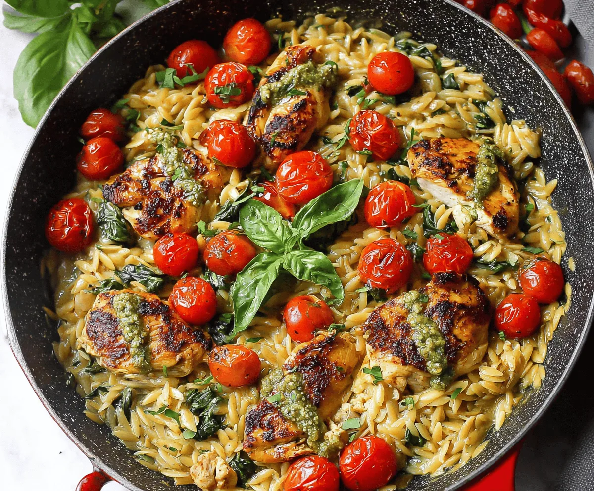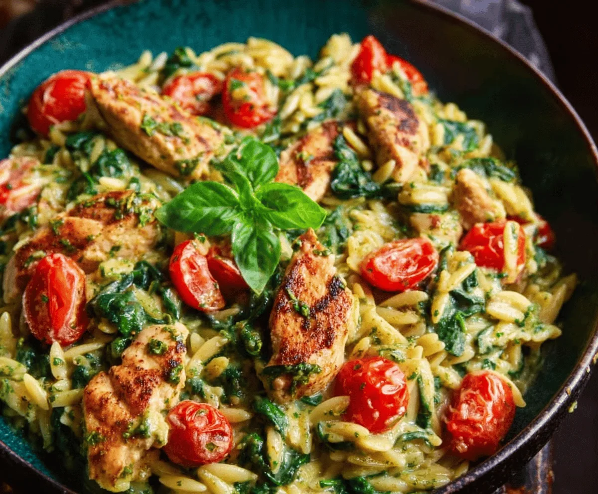 This Creamy Chicken Orzo with Spinach, Cherry Tomatoes, and Basil Pesto is a comforting and fresh pasta dish that brings together tender chicken, small bite-sized orzo pasta, and a creamy sauce that clings to every piece. The pop of juicy cherry tomatoes and vibrant green spinach adds a lovely brightness, while the basil pesto gives it a fresh, herby kick that really ties everything together.