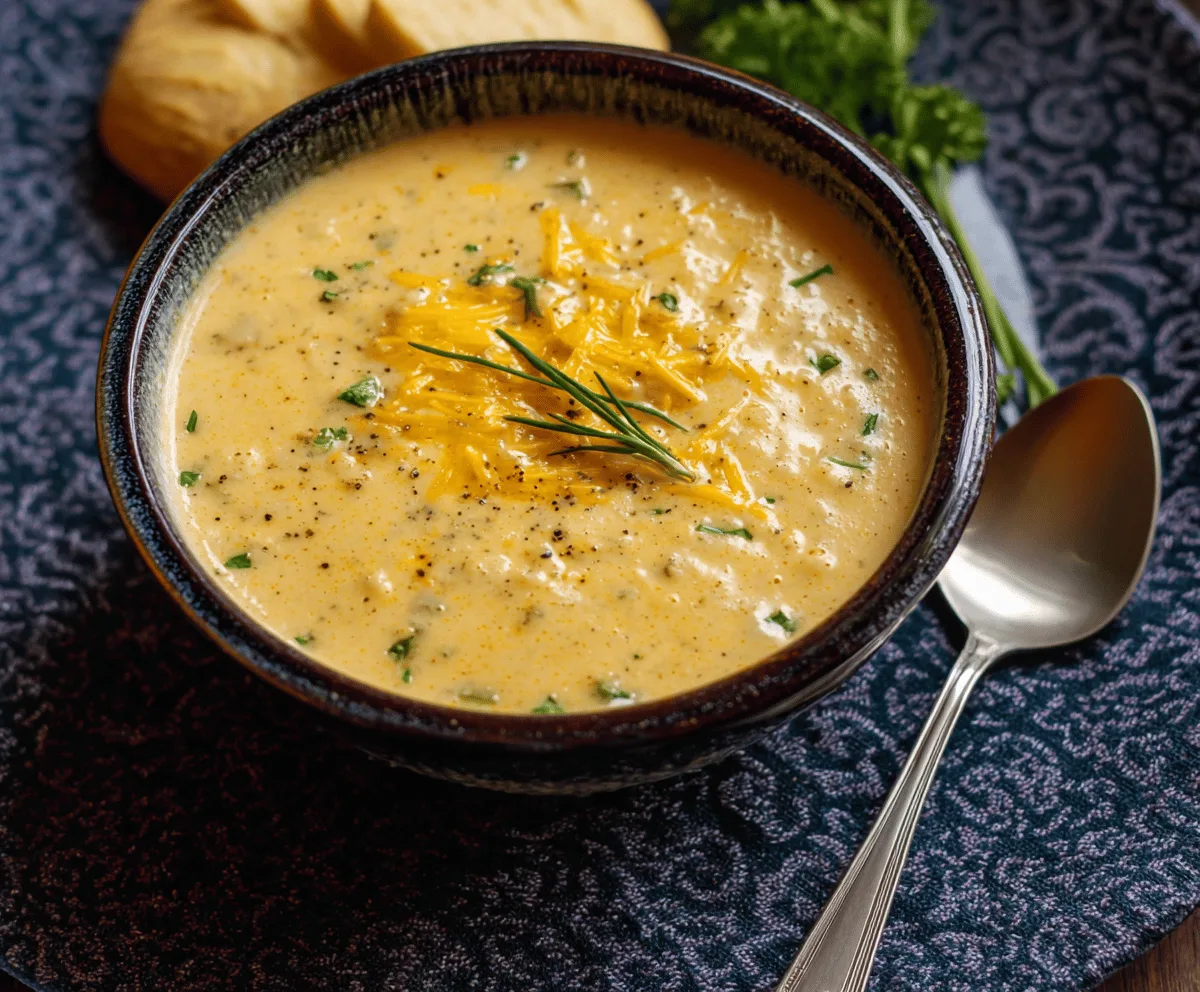 Season the soup with salt and pepper to your liking. Be sure to heat it gently without boiling to keep the cheese from clumping. Ladle the soup into bowls, then garnish with fresh parsley or thyme sprigs. For an extra touch of flavor, sprinkle some crispy bacon or pancetta on top if you like.