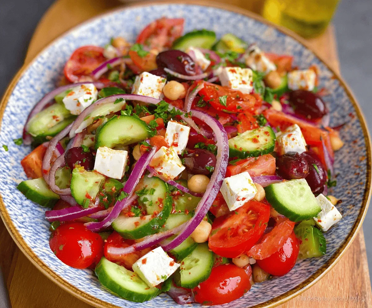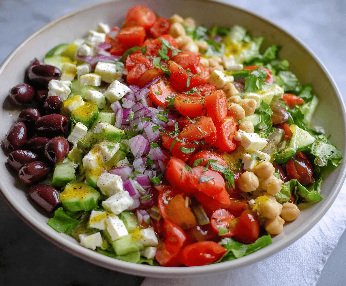 I love making this salad when I want something quick but satisfying. The best part is how easy it is to customize—sometimes I add a handful of fresh herbs like parsley or mint for an extra burst of flavor. The salty feta cheese and olives balance out the veggies perfectly, and I always find myself going back for seconds.