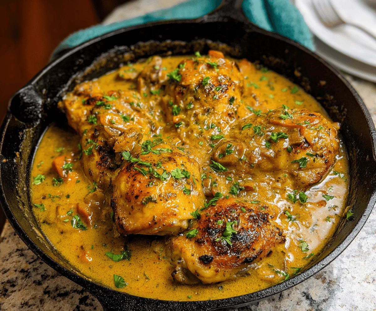 Place the chicken back in the skillet, nestling it in the gravy. Cover the pan with a lid or foil, turn the heat to low, and cook for 25-30 minutes until the chicken is cooked through and tender.
