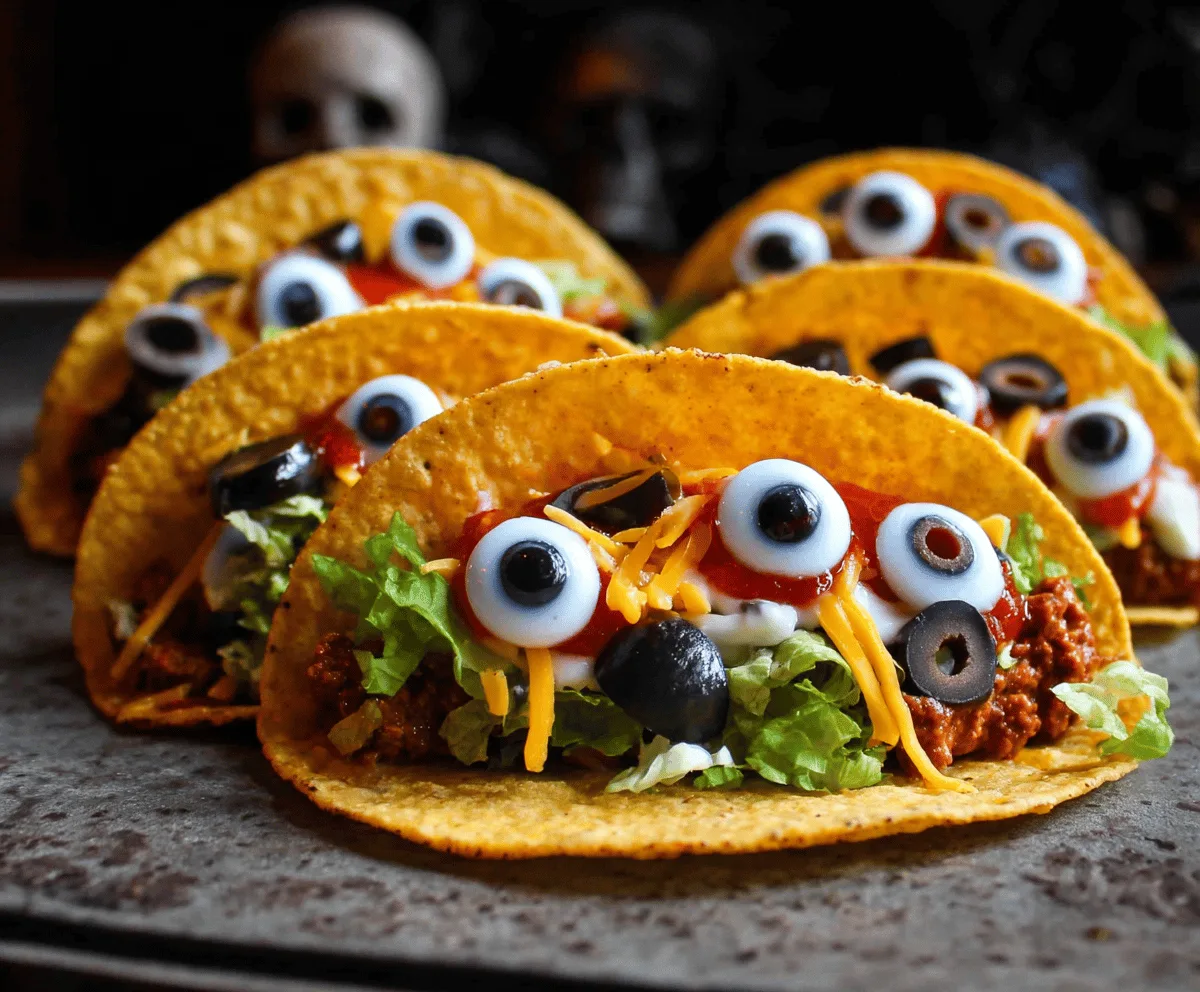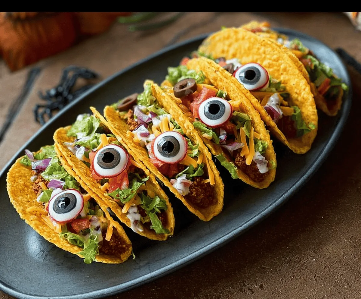 Arrange the tacos so the eyeballs face outward, and serve immediately. Enjoy this fun, festive meal perfect for Halloween or any spooky feast!